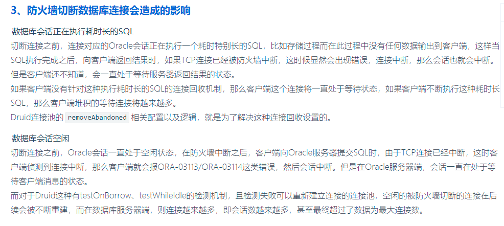 打开druid.keepAlive之后,当连接池空闲时,池中的minIdle数量以内的连接,空闲时间超过minEvictableIdleTimeMillis,则会执行keepAlive操作,即执行druid.validationQuery指定的查询SQL,一般为select * from dual,只要minEvictableIdleTimeMillis设置的小于防火墙切断连接时间,就可以保证当连接空闲时自动做保活检测,不会被防火墙切断