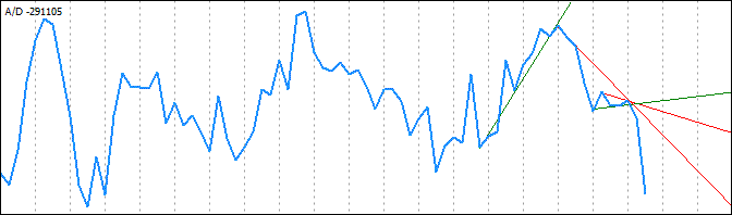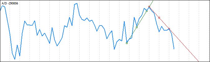 将基于标识的 A/D 图表极值绘制趋势线,因此,上升趋势线连接下极值,下降趋势线连接上极值。