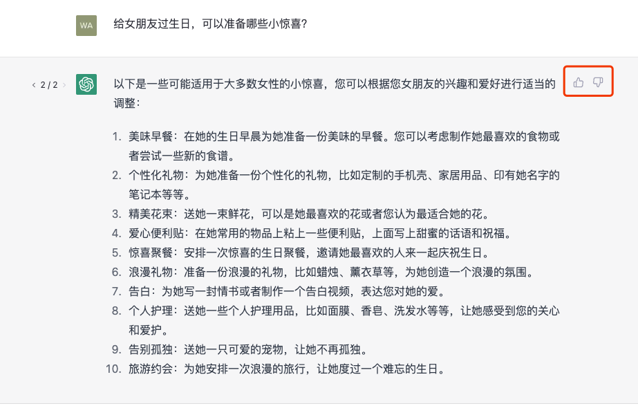 点赞,说明这个回答是正确和有用的。当一个回答收到大量赞时,ChatGPT会认为这个回答是正确和有用的,并在未来类似的情境中优先推荐这个回答。