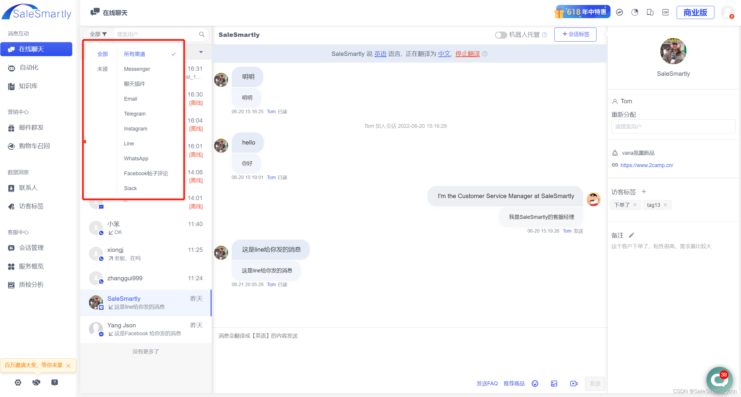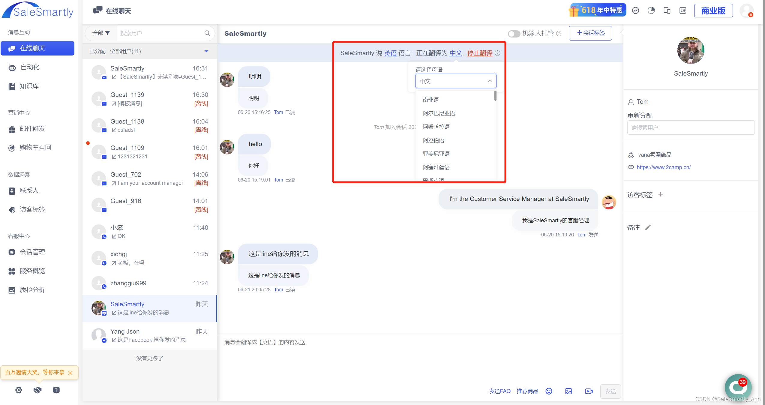 SaleSmartly:支持中英文语种页面,随意切换,100+语言实时翻译,支持定制更多语言。