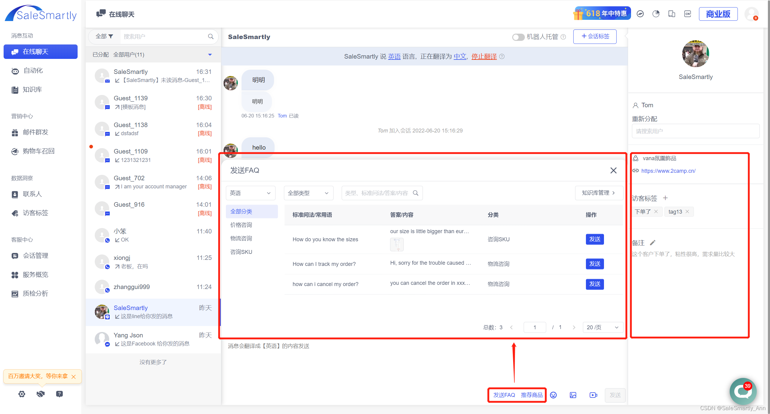 SaleSmartly:系统自带翻译功能,文字收发都将自动翻译。