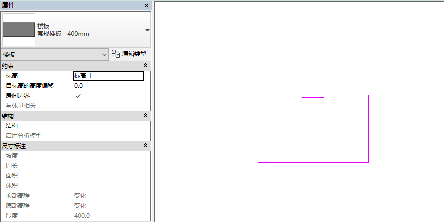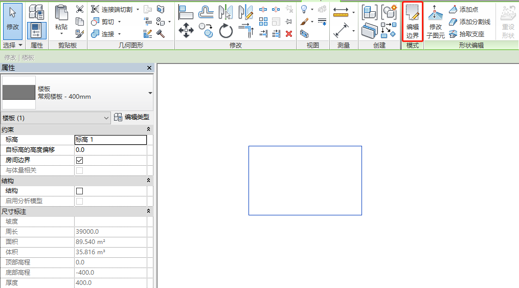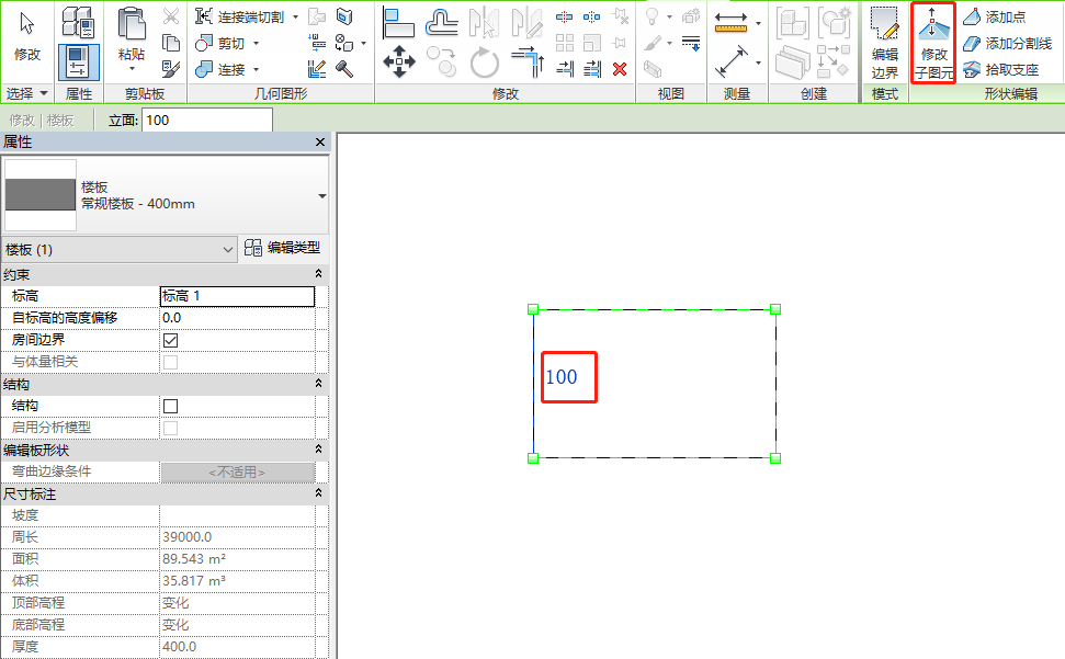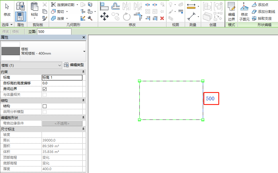框选水平楼板 - 修改子图元 - 左边线设为100 - 右边线设为500