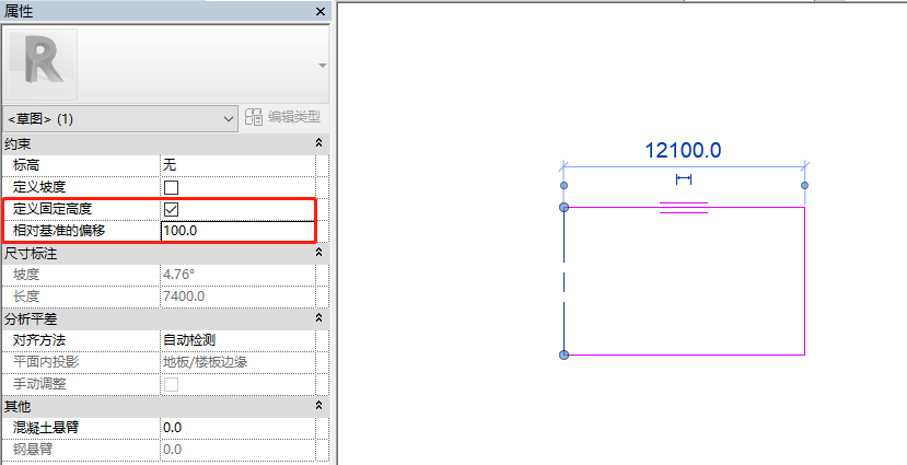 选择左边线 - 勾选“定义固定高度” - “相对基准的偏移”值设为100