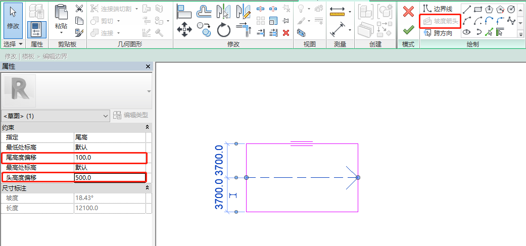 绘制“坡度箭头” - “尾高度偏移”值设为100 - “头高度偏移”值设为500
