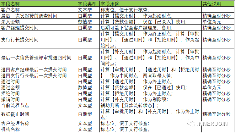 (3)退回客户经理/支行行长最后一次提交时间:该字段中“退回”特指信贷审批部门退回,但在返回的数据中出现了调查B角或支行行长退回的记录,后续会作数据清洗;由于退回有退件和补件之分,故真正最后一次提交时间是两者的最大值;