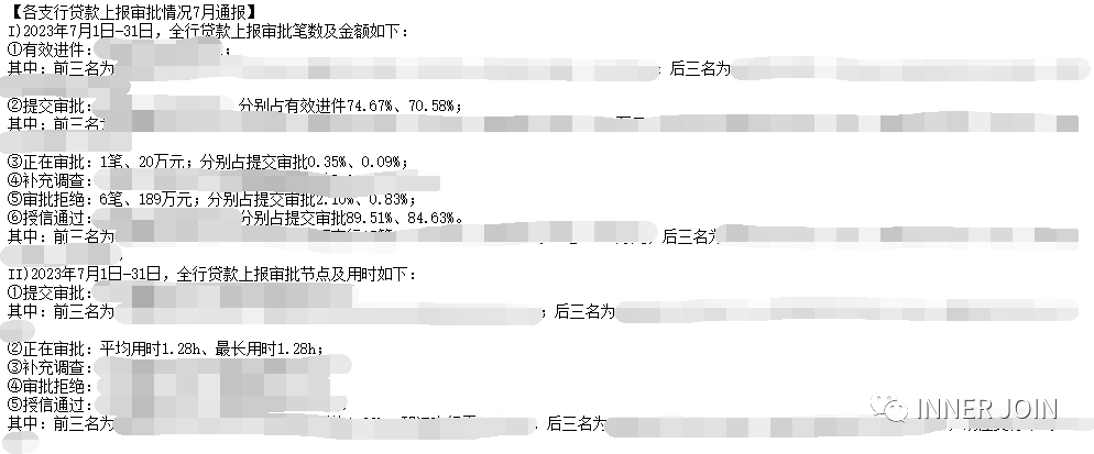 for address in [month_address,week_address]:## 4.1 获取日期区间# 打开工作簿inform_wb = app.books.open(f'{address}')# 获取工作表ws = inform_wb.sheets['各支行贷款上报审批情况统计表']# 读取区域数据data = ws.range('A2').expand('table').value# 将数据重新写入区域ws.range('A2').expand('table').value = data# 获取单元格内容inform_date = ws['A2'].value.split(':')[1]# 关闭工作簿inform_wb.close()## 4.2 撰写通报说明# 读取【当月累计】及【上周累计】的通报数据inform_df = pd.read_excel(f'{address}',sheet_name='各支行贷款上报审批情况统计表',header=3)[:37]# 指定各字段的名称colnames = ['机构名称','数据查询时间','贷款笔数_已录入','贷款金额_已录入','贷款笔数_已提交','贷款金额_已提交','平均时限_已提交','最长时限_已提交','贷款笔数_审批中','贷款金额_审批中','平均时限_审批中','最长时限_审批中','贷款笔数_补资料','贷款金额_补资料','平均时限_补资料','最长时限_补资料','贷款笔数_已拒绝','贷款金额_已拒绝','平均时限_已拒绝','最长时限_已拒绝','贷款笔数_已通过','贷款金额_已通过','平均时限_已通过','最长时限_已通过']# 字段重命名inform_df.columns = colnames# 计算【各机构】中【贷款笔数】、【贷款金额】排名-已录入、已提交、已通过df_input = inform_df.query("机构名称 != '全行'").sort_values(by=['贷款笔数_已录入','贷款金额_已录入','机构名称'],ascending=False).reset_index(drop=True)df_submit = inform_df.query("机构名称 != '全行'").sort_values(by=['贷款笔数_已提交','贷款金额_已提交','机构名称'],ascending=False).reset_index(drop=True)df_pass = inform_df.query("机构名称 != '全行'").sort_values(by=['贷款笔数_已通过','贷款金额_已通过','机构名称'],ascending=False).reset_index(drop=True)# 按固定格式设置通报的内容df_input['通报内容'] = df_input[['机构名称','贷款笔数_已录入','贷款金额_已录入']].apply(lambda x: f'{x[0]}{int(x[1])}笔、{int(x[2])}万元',axis=1)df_submit['通报内容'] = df_submit[['机构名称','贷款笔数_已提交','贷款金额_已提交']].apply(lambda x: f'{x[0]}{int(x[1])}笔、{int(x[2])}万元',axis=1)df_pass['通报内容'] = df_pass[['机构名称','贷款笔数_已通过','贷款金额_已通过']].apply(lambda x: f'{x[0]}{int(x[1])}笔、{int(x[2])}万元',axis=1)# 计算【各机构】中【平均时限】排名-已提交、已通过df_submit_time = inform_df.query("(机构名称 != '全行') & (平均时限_已提交 > 0)").sort_values(by=['平均时限_已提交','贷款笔数_已提交','贷款金额_已提交','机构名称'],ascending=[True,False,False,False]).reset_index(drop=True)df_pass_time = inform_df.query("(机构名称 != '全行') & (平均时限_已通过 > 0)").sort_values(by=['平均时限_已通过','贷款笔数_已通过','贷款金额_已通过','机构名称'],ascending=[True,False,False,False]).reset_index(drop=True)# 按固定格式设置通报的内容df_submit_time['通报内容'] = df_submit_time[['机构名称','平均时限_已提交']].apply(lambda x: f"{x[0]}平均{round(x[1],2)}h",axis=1)df_pass_time['通报内容'] = df_pass_time[['机构名称','平均时限_已通过']].apply(lambda x: f"{x[0]}平均{round(x[1],2)}h",axis=1)# 撰写第一部分:全行贷款上报审批笔数及金额print(f"【各支行贷款上报审批情况{inform_date[0]}月通报】")print(f"I)2023年{inform_date[:inform_date.index('-')+1]}{inform_date.split('-')[1][inform_date.split('-')[1].index('月')+1:]},全行贷款上报审批笔数及金额如下:")print(f"①有效进件:{int(inform_df.iloc[0,2])}笔、{int(inform_df.iloc[0,3])}万元;")print(f"其中:前{num_dict[n]}名为{';'.join(list(df_input.head(n)['通报内容']))};后{num_dict[n]}名为{';'.join(list(df_input.tail(n)['通报内容'])[::-1])};")print(f"②提交审批:{int(inform_df.iloc[0,4])}笔、{int(inform_df.iloc[0,5])}万元;")print(f"其中:前{num_dict[n]}名为{';'.join(list(df_submit.head(n)['通报内容']))};后{num_dict[n]}名为{';'.join(list(df_submit.tail(n)['通报内容'])[::-1])};")print(f"③正在审批:{int(inform_df.iloc[0,8])}笔、{int(inform_df.iloc[0,9])}万元;")print(f"④补充调查:{int(inform_df.iloc[0,12])}笔、{int(inform_df.iloc[0,13])}万元;")print(f"⑤审批拒绝:{int(inform_df.iloc[0,16])}笔、{int(inform_df.iloc[0,17])}万元;")print(f"⑥授信通过:{int(inform_df.iloc[0,20])}笔、{int(inform_df.iloc[0,21])}万元。")print(f"其中:前{num_dict[n]}名为{';'.join(list(df_pass.head(n)['通报内容']))};后{num_dict[n]}名为{';'.join(list(df_pass.tail(n)['通报内容'])[::-1])}。")# 撰写第二部分:全行贷款上报审批节点及用时print(f"II)2023年{inform_date[:inform_date.index('-')+1]}{inform_date.split('-')[1][inform_date.split('-')[1].index('月')+1:]},全行贷款上报审批节点及用时如下:")print(f"①提交审批:平均用时{round(inform_df.iloc[0,6],2)}h、最长用时{round(inform_df.iloc[0,7],2)}h;")print(f"其中:前{num_dict[n]}名为{';'.join(list(df_submit_time.head(n)['通报内容']))};后{num_dict[n]}名为{';'.join(list(df_submit_time.tail(n)['通报内容'])[::-1])};")print(f"②正在审批:平均用时{round(inform_df.iloc[0,10],2)}h、最长用时{round(inform_df.iloc[0,11],2)}h;")print(f"③补充调查:平均用时{round(inform_df.iloc[0,14],2)}h、最长用时{round(inform_df.iloc[0,15],2)}h;")print(f"④审批拒绝:平均用时{round(inform_df.iloc[0,18],2)}h、最长用时{round(inform_df.iloc[0,19],2)}h;")print(f"⑤授信通过:平均用时{round(inform_df.iloc[0,22],2)}h、最长用时{round(inform_df.iloc[0,23],2)}h。")print(f"其中:前{num_dict[n]}名为{';'.join(list(df_pass_time.head(n)['通报内容']))};后{num_dict[n]}名为{';'.join(list(df_pass_time.tail(n)['通报内容'])[::-1])}。\n")# 退出Excel程序