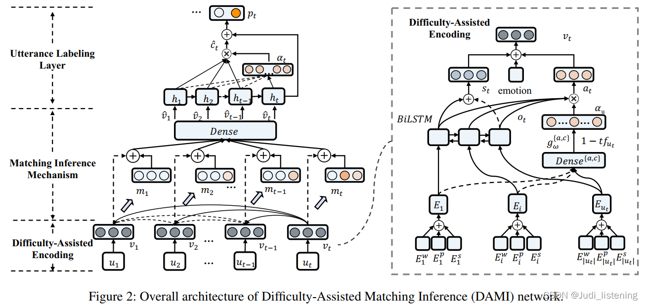 Liu等人 将MHCH定义为分类问题,专注于确定应将哪个句子转移到人工客服处,提出了DAMI和RSSN两篇工作。如图所示,为了检测正常/可转移的话语,DAMI 利用 difficulty-assisted编码来增强话语的表示。此外,引入了匹配推理机制来捕获上下文匹配特征。同时,论文提出了一种新的评估指标,Golden Transfer within Tolerance(GT-T),以通过考虑 MHCH 的公差特性来评估性能。