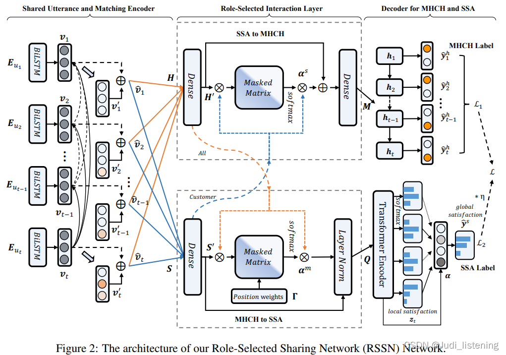 RSSN的结构如下图所示。相比于DAMI,RSSN考虑了对话的情绪状态,将对话满意度估计和切换预测集成在一个多任务学习框架中,通过利用用户局部满意度(每句话)作为桥梁,全局满意度(整个对话)检测器和切换预测器可以有效地交换关键信息。