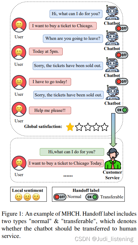 图中“Global satisfaction”是用户对当前chatbot服务的评分,又称全局满意度;“Local sentiment”代表用户每句话的情绪状态,又称局部情绪值。“Handoff label”指MHCH任务的label,“Normal”表示不切换到人工客服处,“Transferable”表示切换到人工客服处。