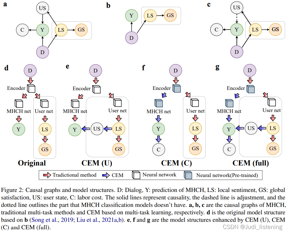 - c:CEM的因果图。相对于b,c引入了两个隐性因果量人工成本(C)和用户状态(US),使得模型能够在降低人工成本的情况下,实现更好的chatbot服务。这里的虚线表示judge关系而非因果关系,这是因为作者考虑到直接建模US->Y的因果关系会使得D成为一个confounder,使得MHCH分支的预测结果不准确。
