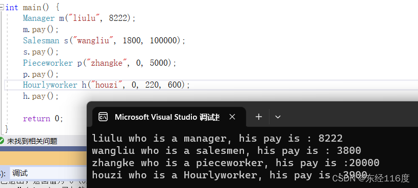 public:Pieceworker(string name, float basepay, int number) :Employee(name, basepay) {this->number = number;}// 重新定义虚函数void pay() {realpay = basepay + number * 4;cout << name << " who is a pieceworker, his pay is :" << realpay << endl;}
