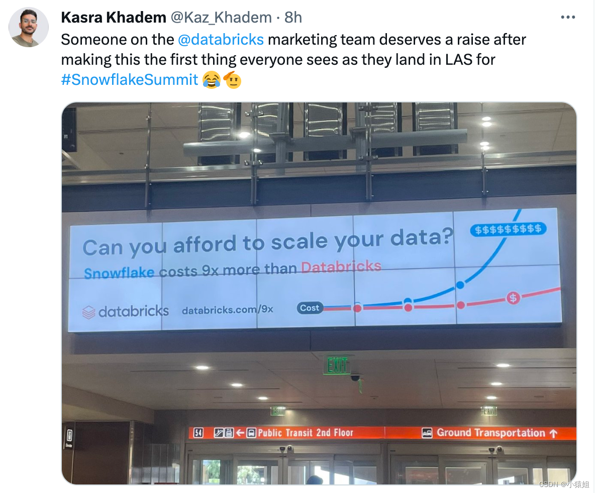 当然,时间上错开,存在感还是得刷。当你去 Snowflake 参会,在拉斯维加斯机场一下飞机,就能看到 Databricks 的广告,架已经掐到家门口了,这不比 cage fight 燃?