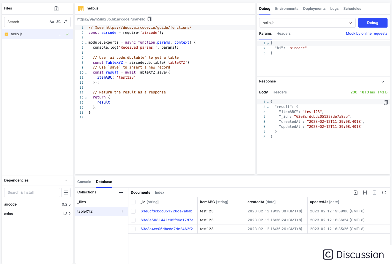 4、AirCode:AirCode 是一个在线开发和部署 Node.js 应用的平台,为全栈工程师量身定制,目标是让开发变得简单。通过提供极致简单的 WebIDE 和开箱即用的云服务,让开发者无需再操心后端选型、环境搭建和线上运维等一系列繁琐之事,只需打开浏览器即可完成产品开发,并部署到全球节点。