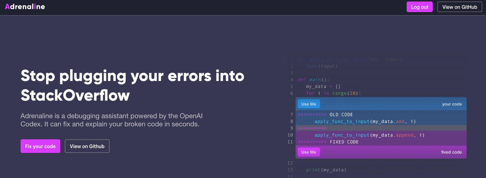 这个团队同时还在做基于 AI 的代码调试和错误日志分析工具:Adrenaline,使用的是 OpenAI 提供的 API,所以你使用的话还需要配置对应的 API key。