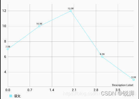 public class LineChartActivity extends AppCompatActivity {private LineChart line;Listlist=new ArrayList<>(); //实例化一个 List 用来保存你的数据@Overrideprotected void onCreate(Bundle savedInstanceState) {super.onCreate(savedInstanceState);setContentView(R.layout.activity_line_chart);line = (LineChart) findViewById(R.id.line);list.add(new Entry(0,7)); //其中两个数字对应的分别是 X轴 Y轴list.add(new Entry(1,10));list.add(new Entry(2,12));list.add(new Entry(3,6));list.add(new Entry(4,3));//list是你这条线的数据 "语文" 是你对这条线的描述(也就是图例上的文字)LineDataSet lineDataSet=new LineDataSet(list,"语文"); LineData lineData=new LineData(lineDataSet);line.setData(lineData);//简单美化// X轴所在位置 默认为上面line.getXAxis().setPosition(XAxis.XAxisPosition.BOTTOM); //隐藏右边的Y轴line.getAxisRight().setEnabled(false); }