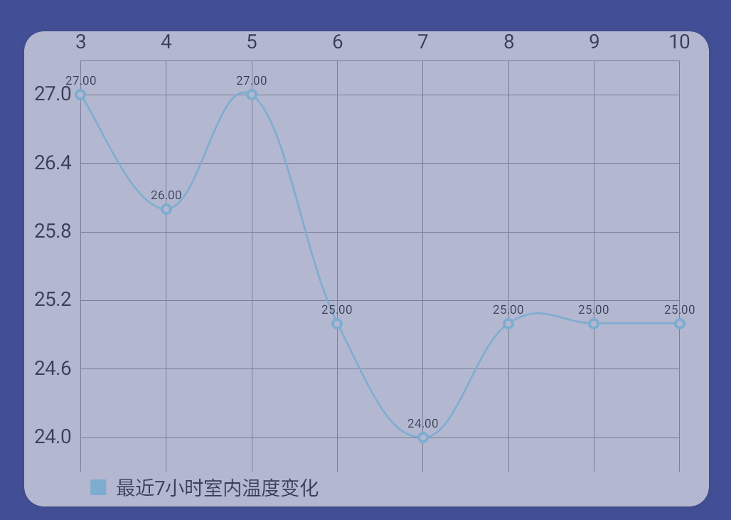 tempchart.getDescription().setEnabled(false);//图表的文本描述,先不管这个设置成false吧tempchart.getAxisRight().setEnabled(false);//禁用右轴ArrayList values1=new ArrayList<>();values1.add(new Entry(3,27));values1.add(new Entry(4,26));values1.add(new Entry(5,27));values1.add(new Entry(6,25));values1.add(new Entry(7,24));values1.add(new Entry(8,25));values1.add(new Entry(9,25));values1.add(new Entry(10,25));LineDataSet set1=new LineDataSet(values1,"最近7小时室内温度变化");set1.setMode(LineDataSet.Mode.CUBIC_BEZIER);//让折线图的曲线平滑LineData data1=new LineData(set1);tempchart.setData(data1);
