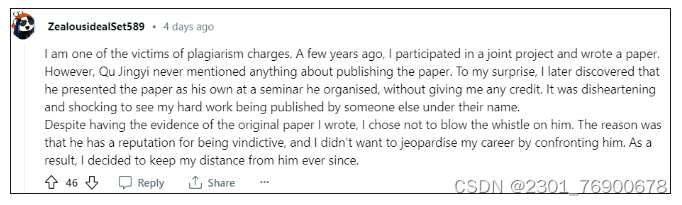 该名网民分享了一名前南洋理工大学学生王岳明于2014年所发布名为“《论阮籍诗文中的逃避主义》的论文,同时也分享了该名教授在2018年所发布名为“Escape as a Mode of Existence”的论文。