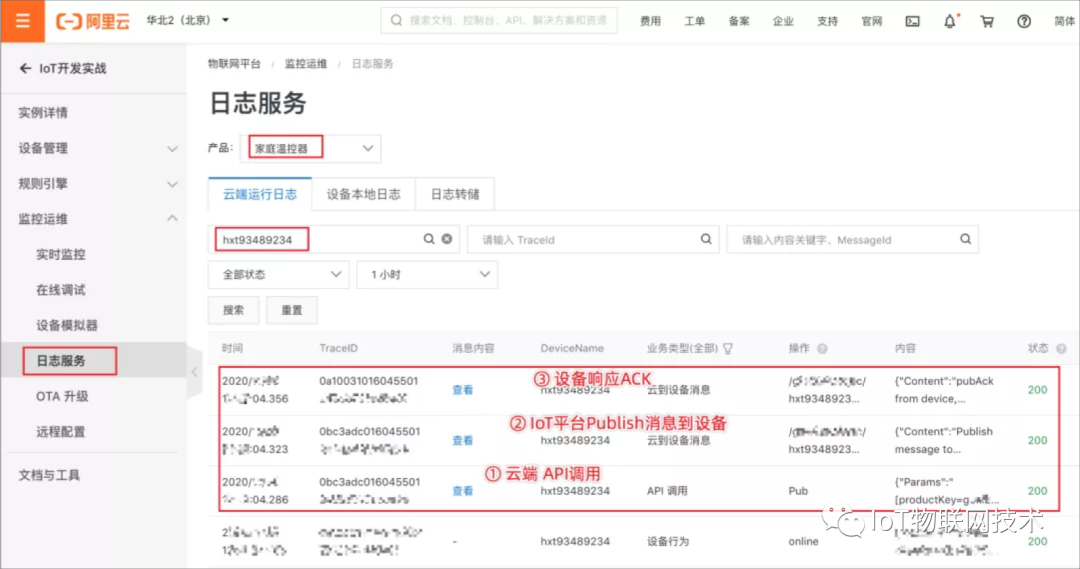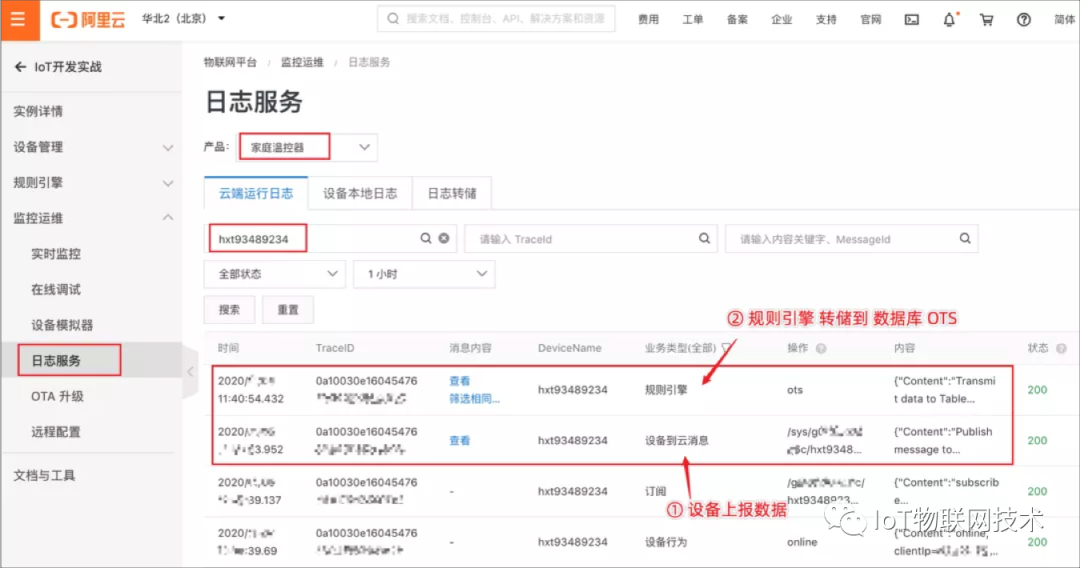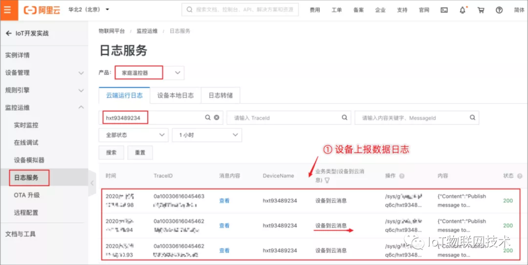 在监控运维的日志服务里,也可以看到设备上报数据的日志。如下图: