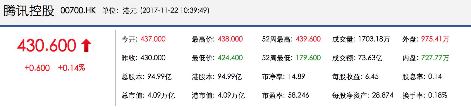 昨天,这一消息一度刷屏文摘菌的朋友圈。今早文摘菌查看时发现,腾讯股价昨日收于430港元,成为亚洲首家市值超过5000亿美元的科技公司。今日开盘报437港元,市值达4.09万亿港元。