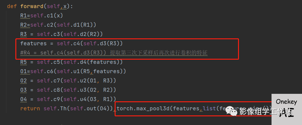 1.选定需要提取特征的layer, 在定义网络结构的py文件里(比如resnet.py)找到forward函数,将其表示为features后return出来,如下图所示(以U-Net为例):
