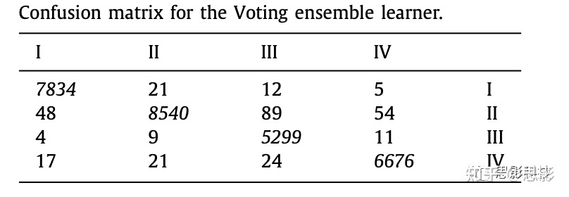 如果与图8中可靠性图所示的趋势相比,这些趋势与完美校准的趋势不太接近:这证实了最佳分类算法是C4.5、随机森林、神经网络和最近邻。我们使用这四个分类器构建集成学习器,并从图7中的校准图中调整权重。使用测试数据集对投票组合学习者进行评估,其性能如表4所示。