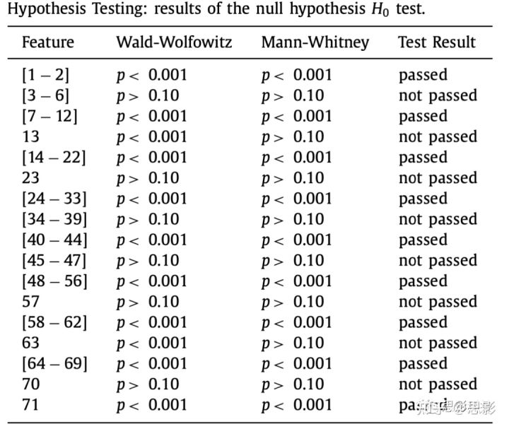 Wald-Wolfowitz测试未通过特征3、4、5、6、23、34、35、36、37、38、39、45、46、47、57和70,而Mann-Whitney测试未通过特征3、4、5、6、13、23、34、35、36、37、38、39、45、46、47、57、63和70。综上所述,考虑到我们假设当两个执行的测试都拒绝了零假设时,结果是有效的,未通过零假设H0测试的特征如下:1, 2, 7, 8, 9, 10, 11, 12, 14, 15, 16, 17, 18, 19, 20, 21, 22, 24, 25, 26, 27, 28, 29, 30, 31, 32, 33, 40, 41, 42, 43, 44, 4 8, 4 9, 50, 51, 52, 53, 54, 55, 56, 58, 59, 60, 61, 62, 64, 65, 66, 67, 68, 69和71等。研究中71个特征中有53个具有显著性。在下文中,将考虑这53个特征来构建模型(即通过假设检验的特征集)。