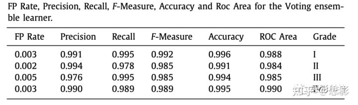表4,投票集成学习器的假阳性比率、精确度、回忆、F值、准确度和Roc面积