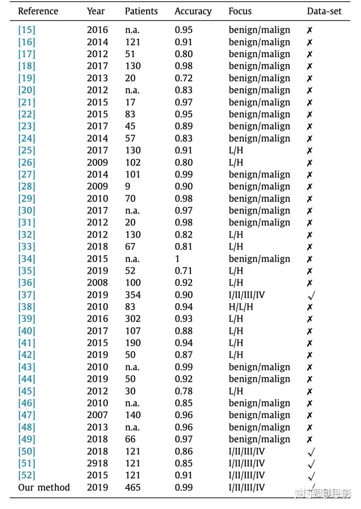 作者在[33]中提出了一种基于36种纹理特征的概率神经网络。作者的目的是区分转移性肿瘤和原发性肿瘤。
