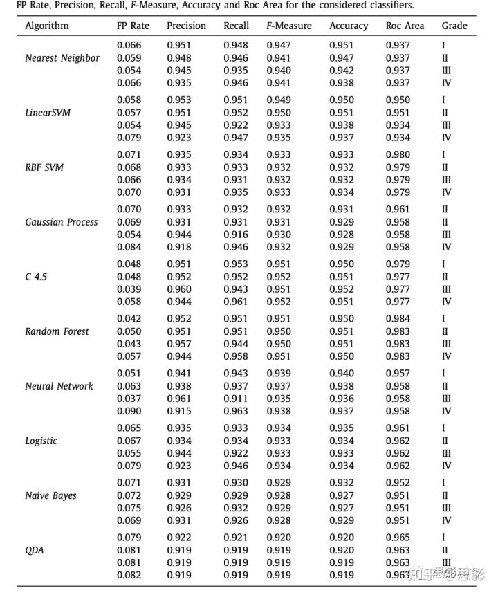 为了获得更好的图形效果,我们显示了与两个特征(即Max-imum2DDiameterColumn和Maximum2DDiameterRow)和两个类别(最具侵袭性的类别,即III级和IV级脑肿瘤)相关的决策边界。对于其他特征和其他等级,也可以进行类似的考虑。与III级脑癌相关的实例用红色点表示,而蓝色点与IV级脑癌(最具侵袭性)相关。具有相同颜色(即红色或蓝色)的区域代表位置分别属于III级或IV级的空间。白色区域与模型无法输出预测的区域相关,而颜色较浅的区域则表示模型能够执行预测但百分比较低的区域。从决策边界来看,具有最大空间覆盖的模型似乎是由最近邻域、C4.5、随机森林和神经网络算法建立的模型。例如,与C 4.5相关的决策边界分析没有显示白色区域,并且它显示出一个非常小的空间,颜色不那么强烈,这表明样本通常是以高概率预测。神经网络模型表现出非常有限的白色区域(在红色区域和蓝色区域之间的边界),最近邻模型也表现出类似的现象。随机森林模型显示了一个小的白色区域(尽管比上述算法稍微扩展)。至于剩下的算法,白色区域得到了更大的扩展:例如,朴素贝叶斯模型展示了一个圆形白色区域和一个略微扩展的低概率区域,逻辑模型显示了一个扩展的白色区域(其中也有几个属于III级脑癌的病例,因此这些病例不能从该模型中正确分类)。QDA模型显示了一个扩展的白色区域,考虑因素与逻辑模型类似。线性SVM和RBF SVM模型似乎不显示白色区域,但这些模型的低概率区域扩展最广,而对于高斯过程算法,从决策边界来看,该模型似乎无法预测与数据集中使用的实例略有不同的实例:白色区域相当广,并且唯一有颜色的区域是样本下降的区域。 为了确认决策边界分析的结果,我们分析了单模型的性能。为了评估分类性能,考虑了六个常用的指标[53]:假阳性率、精确度、召回率、F度量、准确度和ROC面积。 我们计算了每个分类器的指标,结果如表3所示。