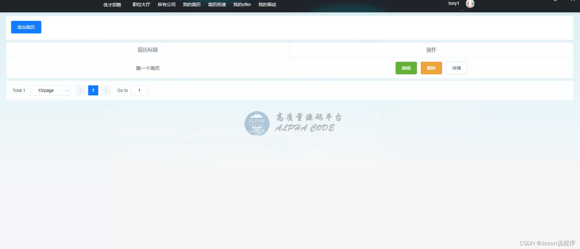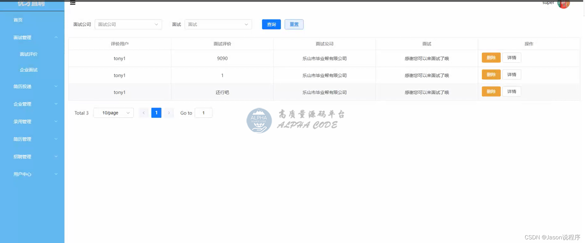 该平台主要使用前端技术包括javascript、html、css、vue、vue-router和axios,后端使用java、spring boot和mybatis-plus,并且使用Jaccard相似度算法进行智能投递计算。数据存储在MySQL数据库中。 开发工具包括vscode和IDEA。 该平台的主要功能包括前台和管理端两部分。前台功能包括最新职位、我的简历、个人信息、职位大厅、所有公司、简历投递、我的offer和我的面试。管理端功能包括面试管理、简历投递、企业管理、录用管理、简历管理和招聘管理。 本论文详细介绍了每个功能模块的实现,以及使用的技术和算法。通过本论文的介绍,读者可以了解如何设计和实现一个高效、可靠的网络招聘平台,从而为人力资源招聘提供更好的服务。