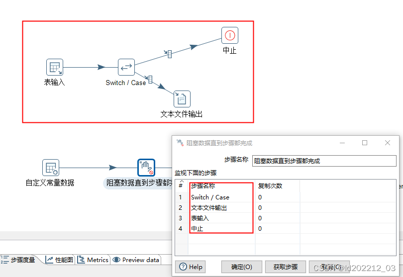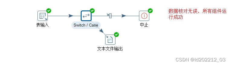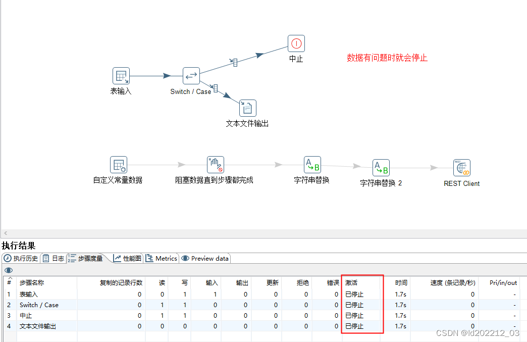 在转换中,如果数据核对无误,就会输出null值,就会进行下一步骤“文本文件输出”,否则就会执行“中止”步骤。