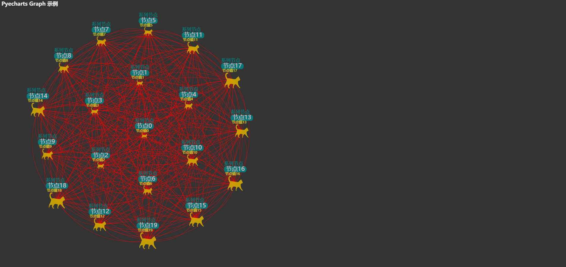 for i in range(20):#node={"name":"节点"+str(i),"symbolsize":20}node=opts.GraphNode(name="节点"+str(i), #节点名称 ★ 不能有重名!value="节点值"+str(i), #节点值symbol_size=10+i, #节点大小symbol="image://cat_brown.svg", #★★★★★ 节点样式可选:'circle', 'rect', 'roundRect', 'triangle', 'diamond', 'pin', 'arrow', 'none', 'image://url'label_opts=label_opts,)nodes.append(node)#连接所有节点