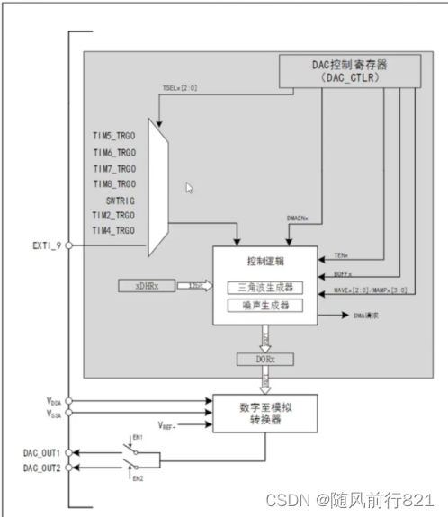 for (uint16_t i=0; i printf ( "adc_data_buffer [ &d][0] = %d,adc_data_buffer [ %d] [1]=%d \r\n" ,i,adc_data_buffer[i] [0] ,i,adc_ OPA初始化 void opa_init (void){ GPIO_InitTypeDef GPIO_Initstructure={0};OPA_InitTypeDef OPA_Initstructure={0}; OPA4初始化 RCC_APB2PeriphclockCmd (RCC_APB2Periph_GPIOC,ENABLE ) ; GPIo_Initstructure.GPIo_Pin = GPIo_Pin_4 |GPIO_Pin_3; GPIO_Initstructure.GPIO_Mode = GPIo_Mode_IN_FLOATING; GPIO_Initstructure.GPIO_Speed = GPIO_speed_50MHz; GPIO_Init(GPIOC,&GPIO_Initstructure) ; OPA Initstructure.OPA_NUM=OPA4; OPA Initstructure.PSEL=CHP1;oPA Initstructure.NSEL=CHN1; OPA1初始化 RCC APB2PeriphclockCmd (RCC_APB2Periph_GPIOB,ENABLE ); GPIO_Initstructure.GPIO_Pin = GPIo_Pin_11|GPIO_Pin_15; GPI0 Initstructure.GPIO_Mode = GPIo_Mode_IN_FLOATING; GPIO_Initstructure.GPIO_Speed = GPIo_Speed_50MHz; GPIO_ Init (GPIOB,&GPIO_ Initstructure) ; OPA_Initstructure.oPA_NUM=OPA1; OPA Initstructure.PSEL=CHPO;oPA Initstructure.NSEL=CHNO; OPA Initstructure.Mode=OUT_IO_OUT0;OPA Init ( &OPA_Initstructure); oPA_Cmd ( oPA1,ENABLE); OPA_Initstructure.Mode=oUT_Io_OUTO; OPA_Init ( &OPA_Initstructure) ; OPA_Cmd ( oPA4,ENABLE); DAC功能框图 输出通道 定时器8的初始化 void timer8_init (uint16_t arr, uint16_t psc) TIM TimeBaseInitTypeDef TIM_ TimeBaseInitstructure={0}; RCC_APB2Periphclockcmd ( RCC_APB2Periph_TIM8,ENABLE ); TIM TimeBaseinitstructure.TIM_Period = arr; TIM TimeBaseInitstructure.TIM_Prescaler = psc; TIM TimeBaseInitstructure.TIM ClockDivision = TIM_CKD_DIV1; TIMTimeBaseInitstructure.TIM_CounterMode=TIM_CounterMode_up; TIM_TimeBaseInitstructure.TIM_Repetitioncounter = 0x00; TIM_TimeBaseInit( TIM8,&TIM_TimeBaseInitstructure); TIM selectoutputTrigger(TIM8,TIM_TRGOSource_Update) ; TIM Cmd (TIM8,ENABLE); DAC初始化 void dac init(void) GPIO_InitTypeDef GPIO_Initstructure = {0 }; DAC_InitTypeDef DAC_InitType = {0 } ; RCC_APB2PeriphclockCmd(RCC_APB2Periph_GPIOA,ENABLE); RCC_APB1PeriphclockCmd(RCC_APB1Periph_DAC,ENABLE); GPIO_Initstructure.GPIO_Pin = GPIO_Pin_4; GPIO_Initstructure.GPIO_Mode=GPIO_Mode_AIN; GPIO_Initstructure.GPIO_speed = GPIo_speed_50MHz; GPIO_Init(GPIOA,&GPIO_Initstructure) ; GPIO_setBits (GPIOA,GPIO_Pin_4) ; timer8 触发 DAC_InitType. DAC_Trigger = DAc_Trigger_T8_TRGO; 不使用三角波或伪噪声 DAC InitType.DAC_waveGeneration = DAC_waveGeneration_None; 使能输出Buffer,减少输出阻抗 DAc_InitType.DAc_outputBuffer = DAC_outputBuffer_Enable; DAC_Init (DAc_Channel_1,&DAc_InitType) ; DAC_Cmd (DAC_Channel_1,ENABLE); 使能DAC DMA dac dma init( ) ; DAC DMACmd (DAC Channel 1,ENABLE); 定时器8初始化 timer8_init (10,720-1); } ADC DMA中断服务函数 attribute _( (interrupt ( "WCH-Interrupt-fast"))) void DMA1_Channel1_IRQHandler (void) DMA_ClearITPendingBit (DMA1_IT_TC1) ; DMA1 channel1->CFGR &= (uint16 t)(~DMA_CFGR1_EN); DMA2_Channel3->CFGR &=(uint16_t) (~DMA_CFGR1_EN); if (adc_buffer_flag == o ) { adc buffer_flag = 1; DMAl channel1->MADDR = (uint32 t)adc_data buffer_2; DMA2_Channel3->MADDR = (uint32_t) adc_data buffer_1;//dac输出 } Else{ adc buffer_flag = 0; DMA1_Channel1->MADDR = (uint32_t)adc_data buffer_l; DMA2Channel3->MADDR = (uint32_t)adc_ data buffer_ 2; } DMA2Channel3->CNTR = ADC_DATA_LENGTH; DMA2 Channel3->CFGR|= DMA CFGR1 EN;//启动DAC DMA DMA1Channel1->CNTR = ADC_DATA_LENGTH; DMA1 Channel1->CFGR|= DMA CFGR1 EN;//启动DAC DMA 经过4个星期的学习,让我对单片机有了更深的了解。同时此次实验过程也让我明白了理论知识只有和实践结合才能取得更好的效果。希望今后能够经常开展实验,加强自己的动手能力,感谢老师们的教导。