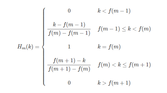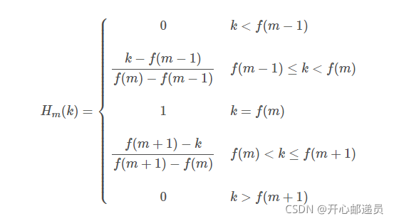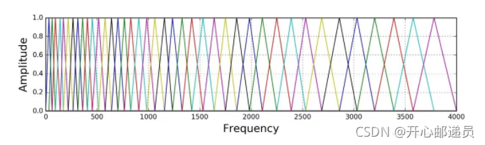 每个滤波在中心频率的响应都是1,然后线性下降,一直到相邻三角滤波的中心频率处为0,如图所示:
