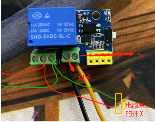一般来说电脑关机之后usb5v是正常工作的,所以找一个usb的电源接上这个继电器驱动模块