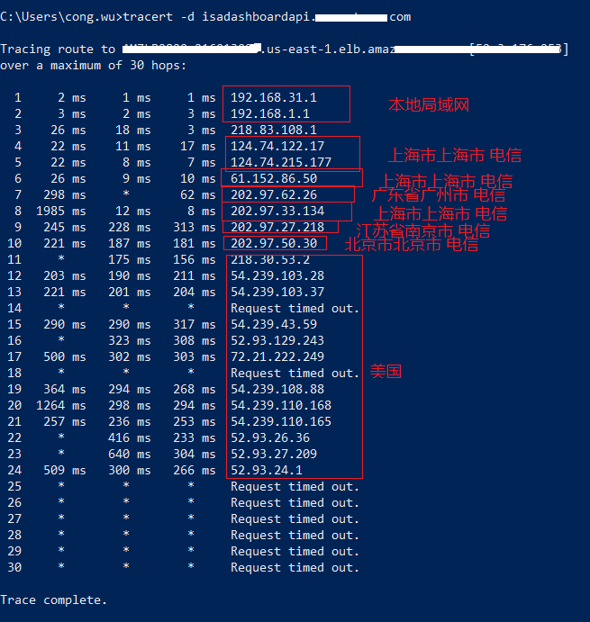 最左侧的,1,2,3,4~,这标明在我使用的宽带,经过的路由节点。