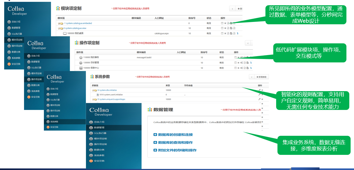 例如二维码生成和解析、OCR识别、支付宝及微信支付、Word在线编辑、文件在线预览等可调用后台.net不同的页面,传递相关参数快速实现,开发人员亦可自己编写.net程序或组件与Colloa整合后调用。