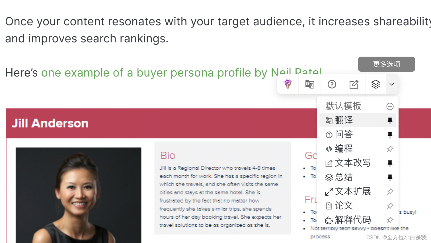 5.快速查找按钮:您可以在浏览页面时选择不同的文本,对其快速进行翻译、扩写、总结等功能。