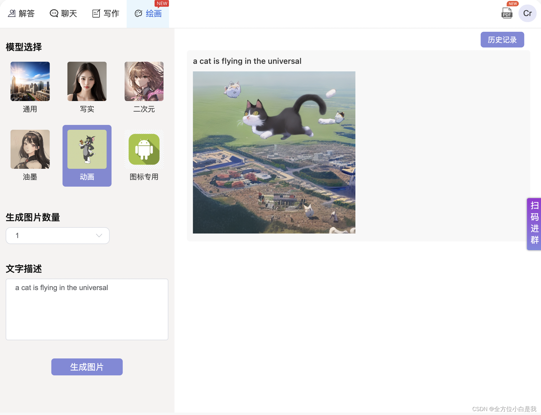 4.绘画模式:一款功能可以与Midjourney比拟的AI绘画功能,使用英文的描述让AI为你生成真人向、动漫向、logo等图片,相当实用。
