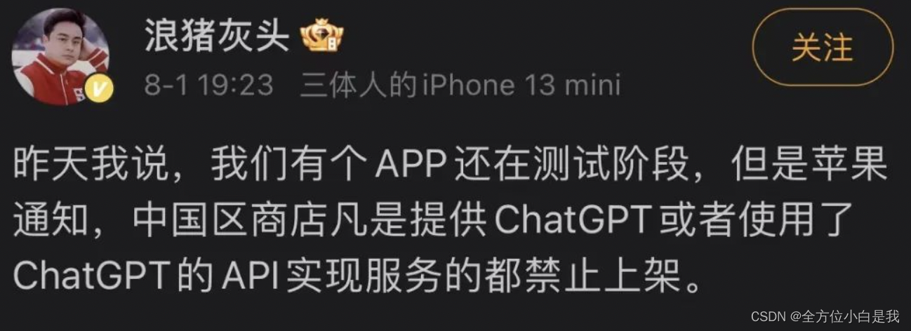 与此同时,微博大V“浪猪灰头”8月1日也在微博上透露了相同的内容:“苹果中国区商店通知,提供ChatGPT,或者利用ChatGPT接口实现服务的App,要求下架。”其公司还处于测试阶段的一款产品不得不因此搁浅。