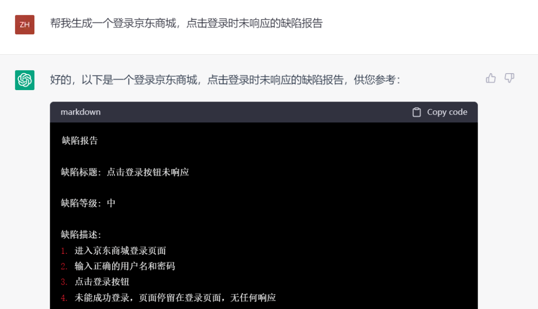 对缺陷进行管理,ChatGPT 可自动生成缺陷报告,提供有关缺陷的详细信息,例如缺陷的标题、等级、描述、复现步骤、预期结果等。