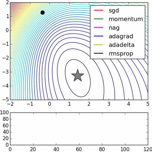 上图展示了不同的迭代算法(优化器)的迭代过程效果。