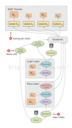 (1)子过程1:构建正向传播数据流图 ,即原函数f(x1,x2,....) ,在上图中,体现在Relu层和logit层 + softmax。