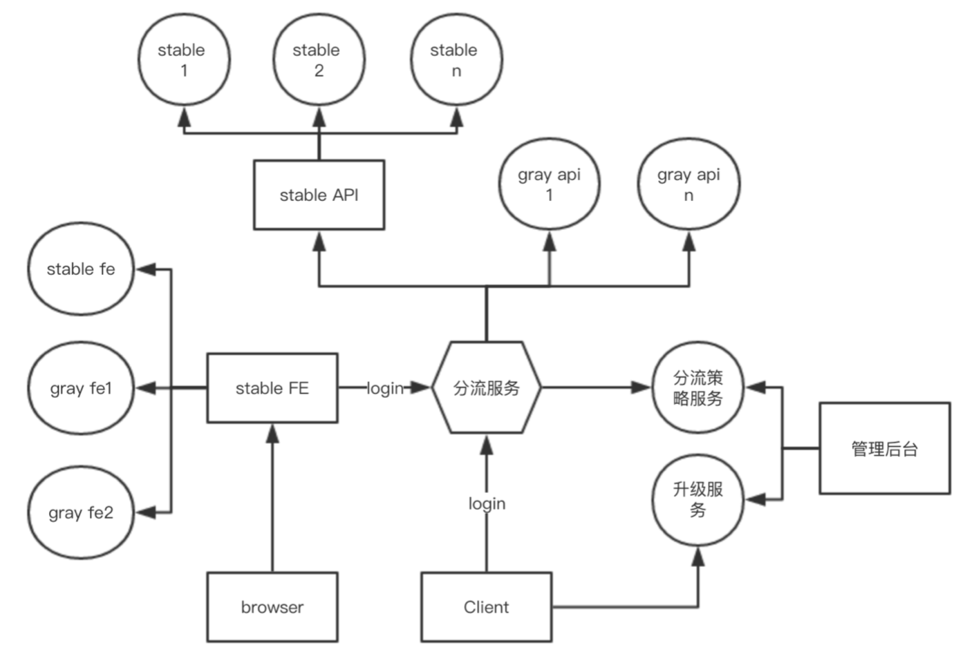 图为整体架构图,分为fe部署块、api部署块、分流策略、升级服务、管理后台