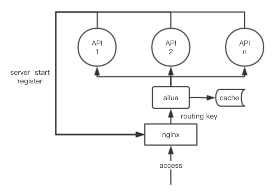 - 客户端用路由key请求api服务,请求到nginx后,检查请求中有没有上传路由key字段,没有则走默认后端路由,如果上传则检查cache中有无对应key的服务映射,有映射直接代理到对应服务,否则采用取模hash选择一个有效服务,代理过去并且存储映射到cache