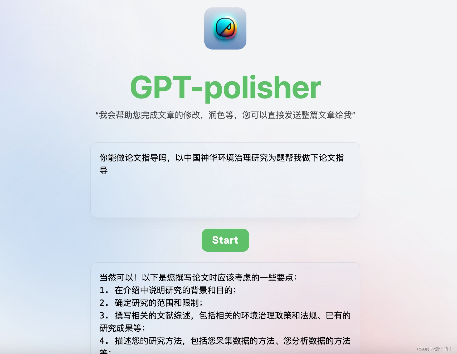 经过这些天的不断摸索,我搭建的个人网站终于上线啦,当然还是接入的ChatGPT3.5模型的版本,这次我加入了许多的prompt和限制,使他成为了一个专门的文章润色机器人,它可以帮你改进,润色文章,做论文指导等等功能,它甚至可以陪你聊天[旺柴]当然还有许多功能等待挖掘,由于我只是调用API的民工,所以是免费版本,最后不要轻信市面上任何收费的ChatGPT,他们也仅仅只是调用API,千万别被割韭菜了