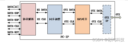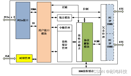 IP Core通过逻辑硬件实现FC-AE-ASM,FC-AE-RDMA,FC-AE-1553,FC-AV协议,减少了CPU的负荷,从而满足了实时性、高可靠性及快速开发产品的要求。