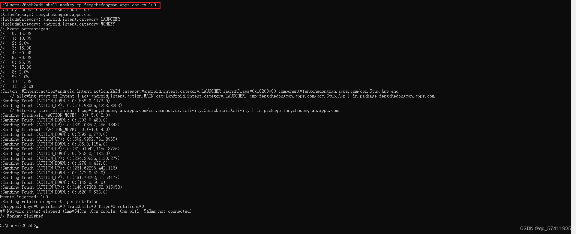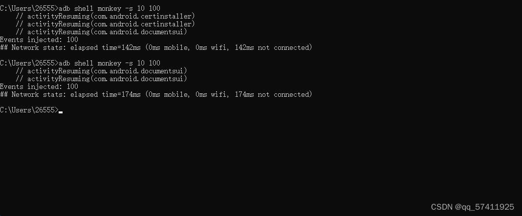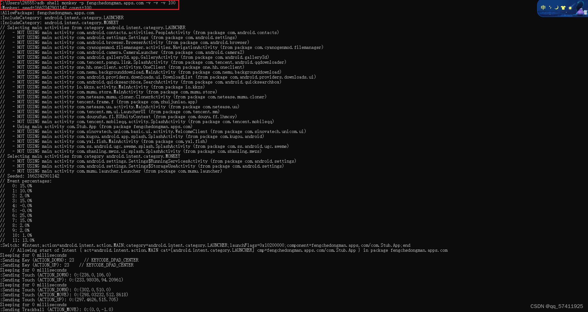 等级二:adb shell monkey -p 包名 -v -v 100 提供较为详细的日志,包括每个发送到Activity的事件