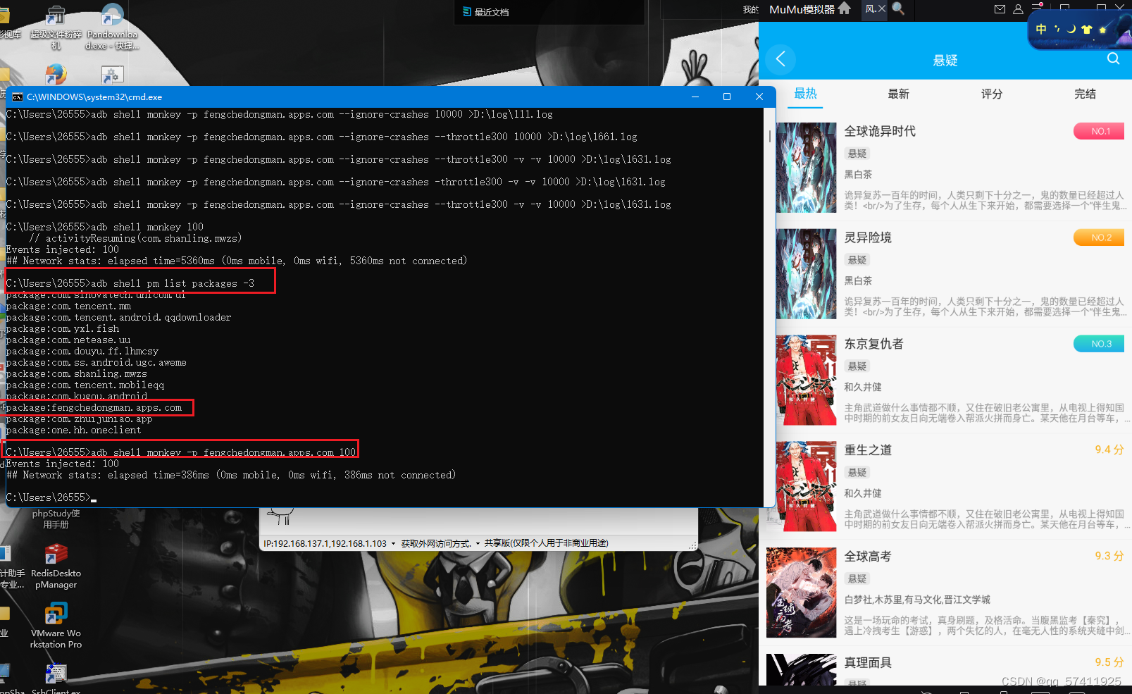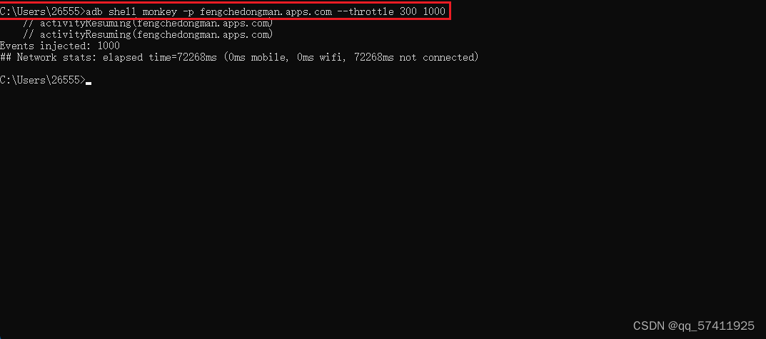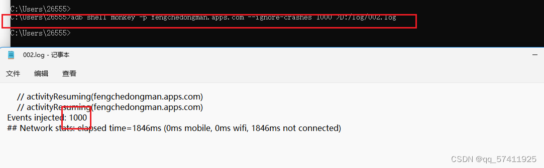 实操:adb shell monkey -p fengchedongman.apps.com --throttle 300 --ignore-crashes --ignore-timeouts -v -v -v 1000 >D:/log/003.log