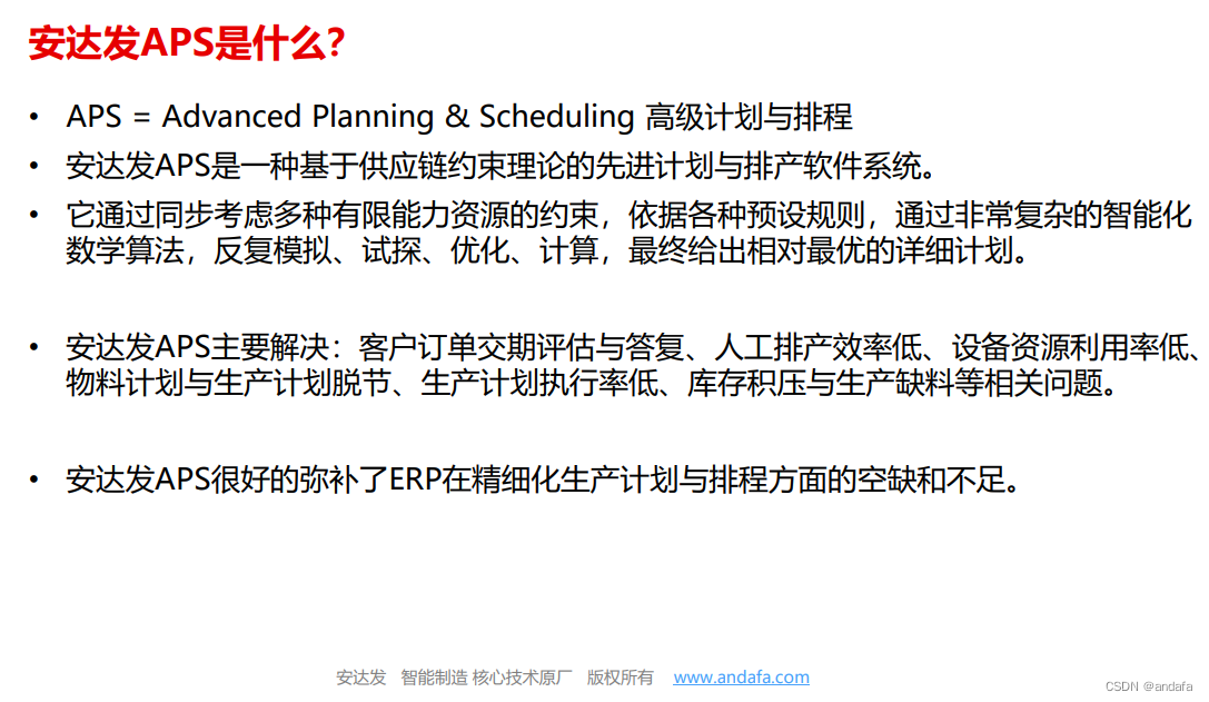 APS计划排程通过销售预测、物流运输计划、生产需求计划、智能优化排产、高级物料需求计划、供应商交货计划为企业提供供应链全流程计划与排产解决方案,实现交货需求、生产计划、采购计划、自制件、外购件的拉动式协同供应,从而显着减少交期延误、库存积压、与生产欠料等重大问题。